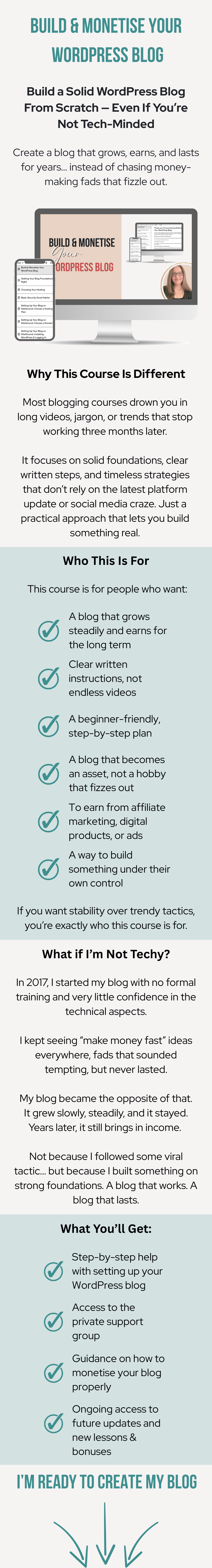 Disclaimer: Results will always vary from person to person. Building a successful blog takes time, consistency, and real work. This course gives you the guidance and tools, but it can’t guarantee specific outcomes or earnings.